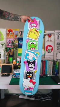 Materials: Blank skateboard, Golden Artist Colors acrylic paint, Posca acrylic marker, Micron pen, finished with gloss brilliant varnish