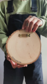 Materials: Round bark wood slice, moss, acorns, twigs, glue gun, glue sticks, Posca acrylic marker, Micron pens, Golden paint, finished with high gloss varnish