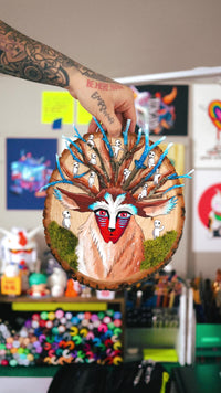 Materials: Round bark wood slice, moss, twigs, glue gun, glue sticks, Posca acrylic marker, Micron pens, Golden paint, finished with high gloss varnish