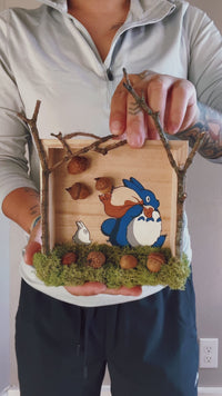 Materials: Wooden shadow box, moss, twigs, acorns, sand paper, glue gun, glue sticks, Posca acrylic marker, Micron pens, finished with high gloss varnish